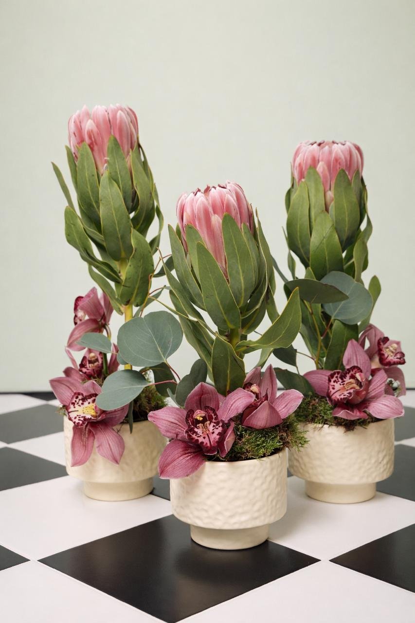 A soft, romantic arrangement featuring blush pink roses, delicate lilac blooms, and bold proteas, beautifully styled.